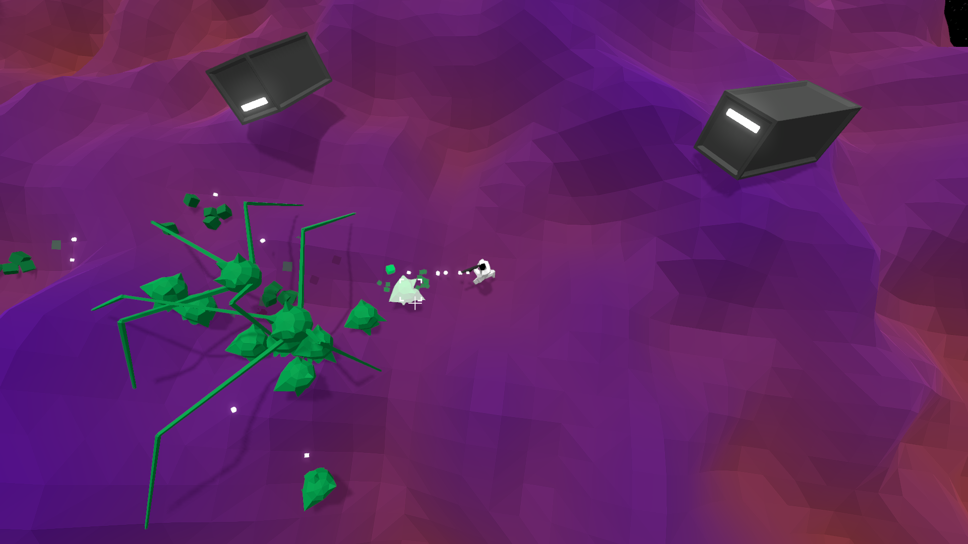 I set out to make a perfect twin-stick shooter for myself. Something with strict a focus on satisfying shooting action with minimal distractions. As an older gamer with slow reflexes, I also wanted to make it relatively slow-paced so that I'd have time to plan ahead and strategize instead of continuously struggling to avoid failure. Visually, I wanted it to be minimal and as clear as possible.